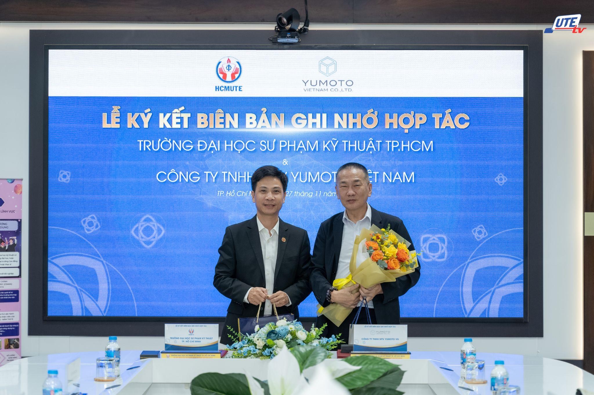 Đại diện HCMUTE tặng hoa cảm ơn đại diện Công ty TNHH MTV Yumoto Việt Nam