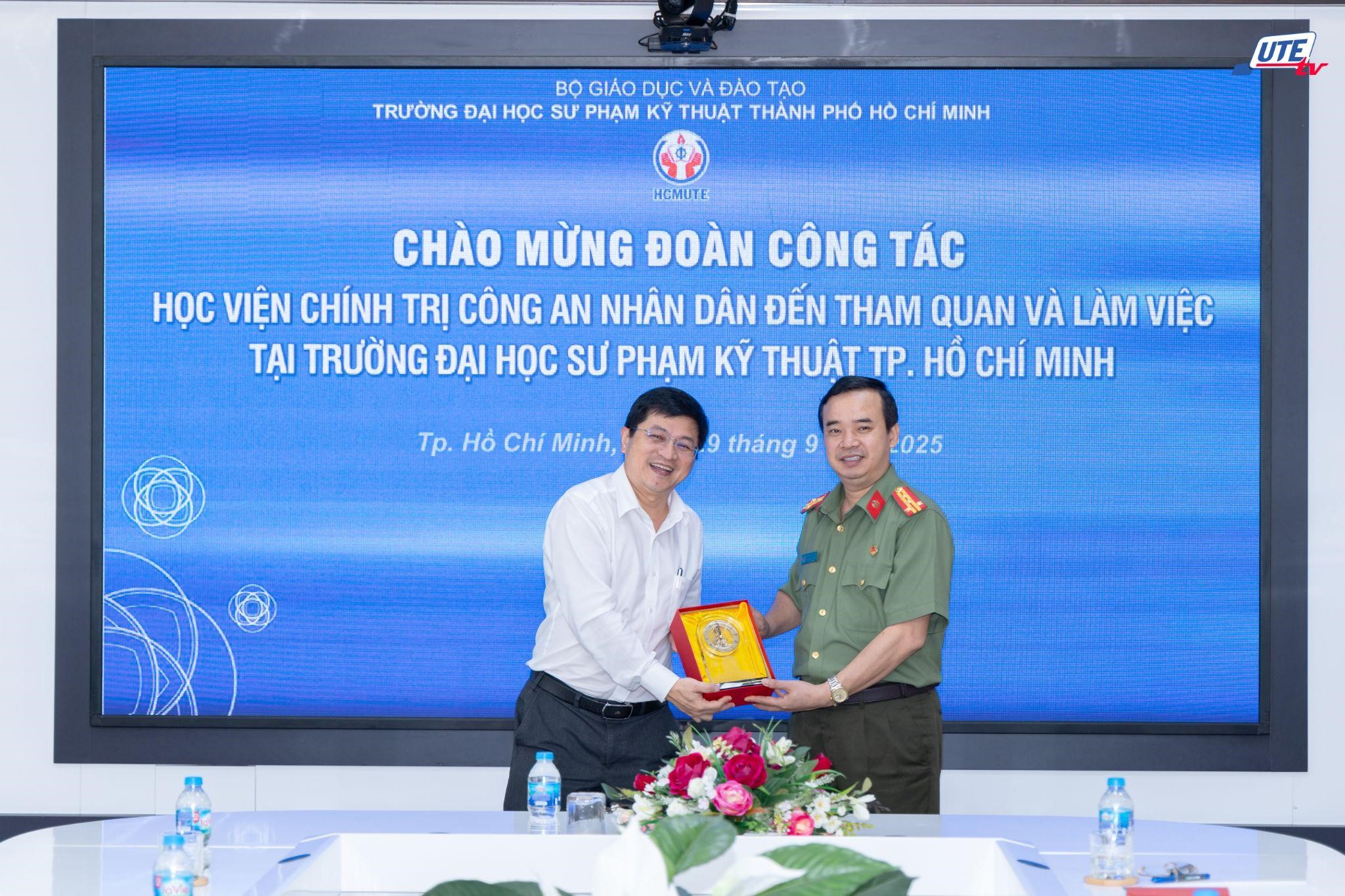 Sáng ngày 29/09/2025, tại Phòng họp I, Trường Đại học Sư phạm Kỹ thuật TP. Hồ Chí Minh (HCMUTE) đã đón tiếp và làm việc cùng đoàn công tác Học viện Chính trị Công an Nhân dân – Bộ Công an. Buổi gặp gỡ là dịp để hai đơn vị cùng tham quan, chia sẻ kinh nghiệm trong công tác đào tạo, phát triển đội ngũ nhân sự và thúc đẩy chuyển đổi số trong giáo dục.