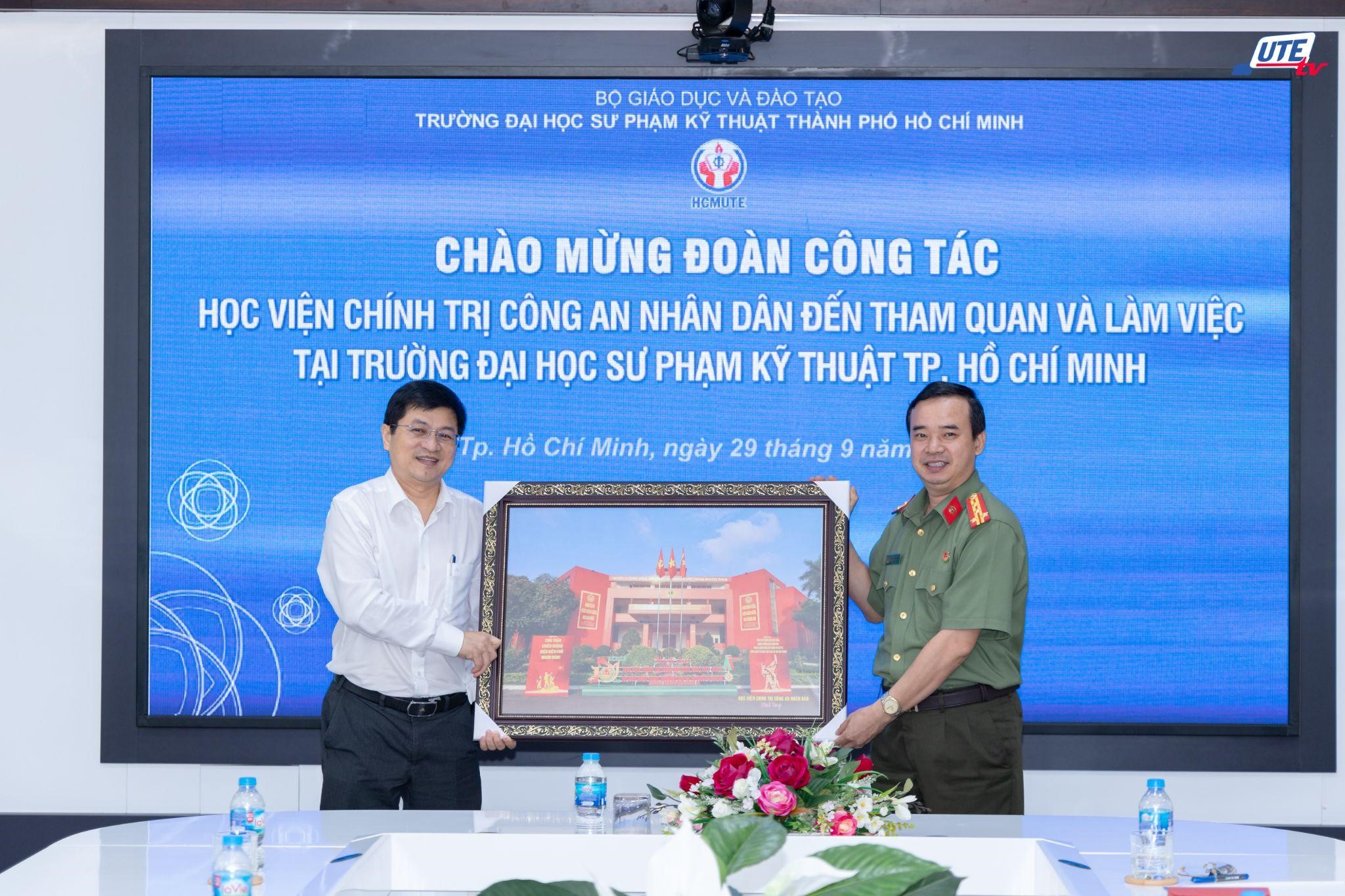 Đại diện HCMUTE tặng quà lưu niệm cho đại diện Học viện Chính trị Công an Nhân dân