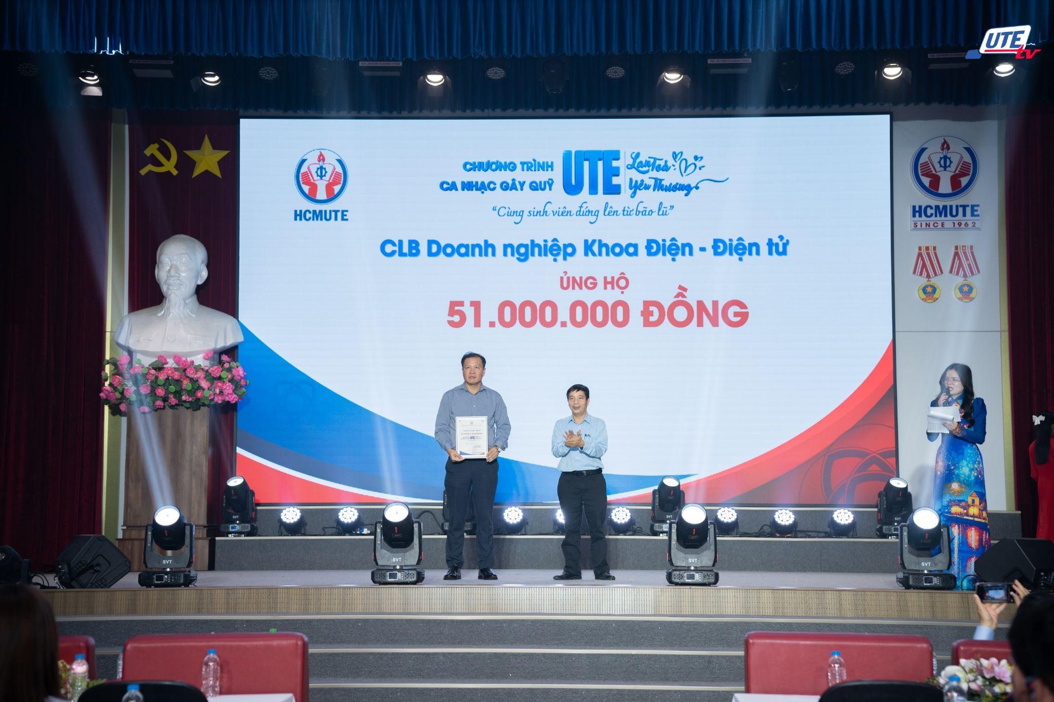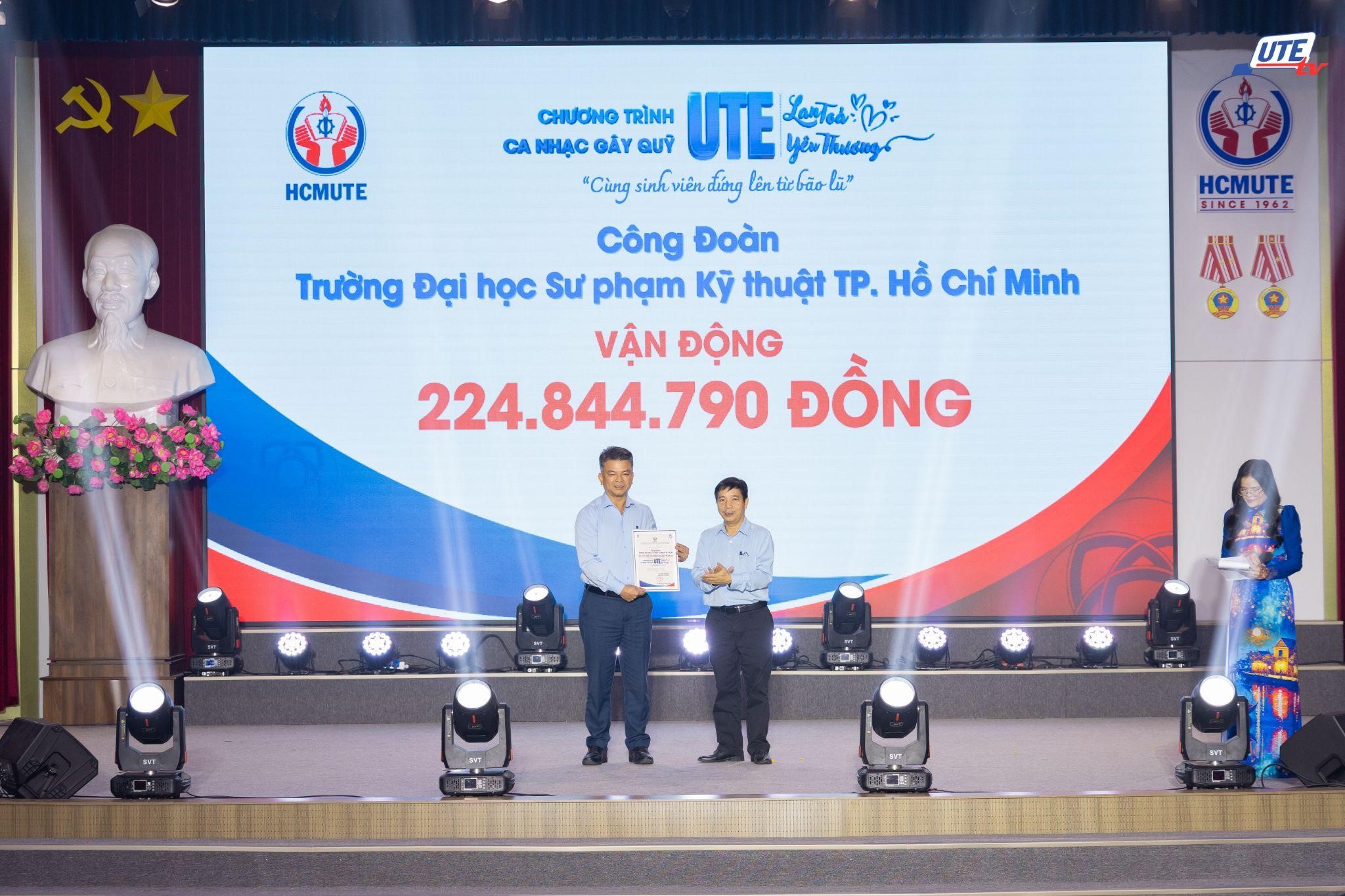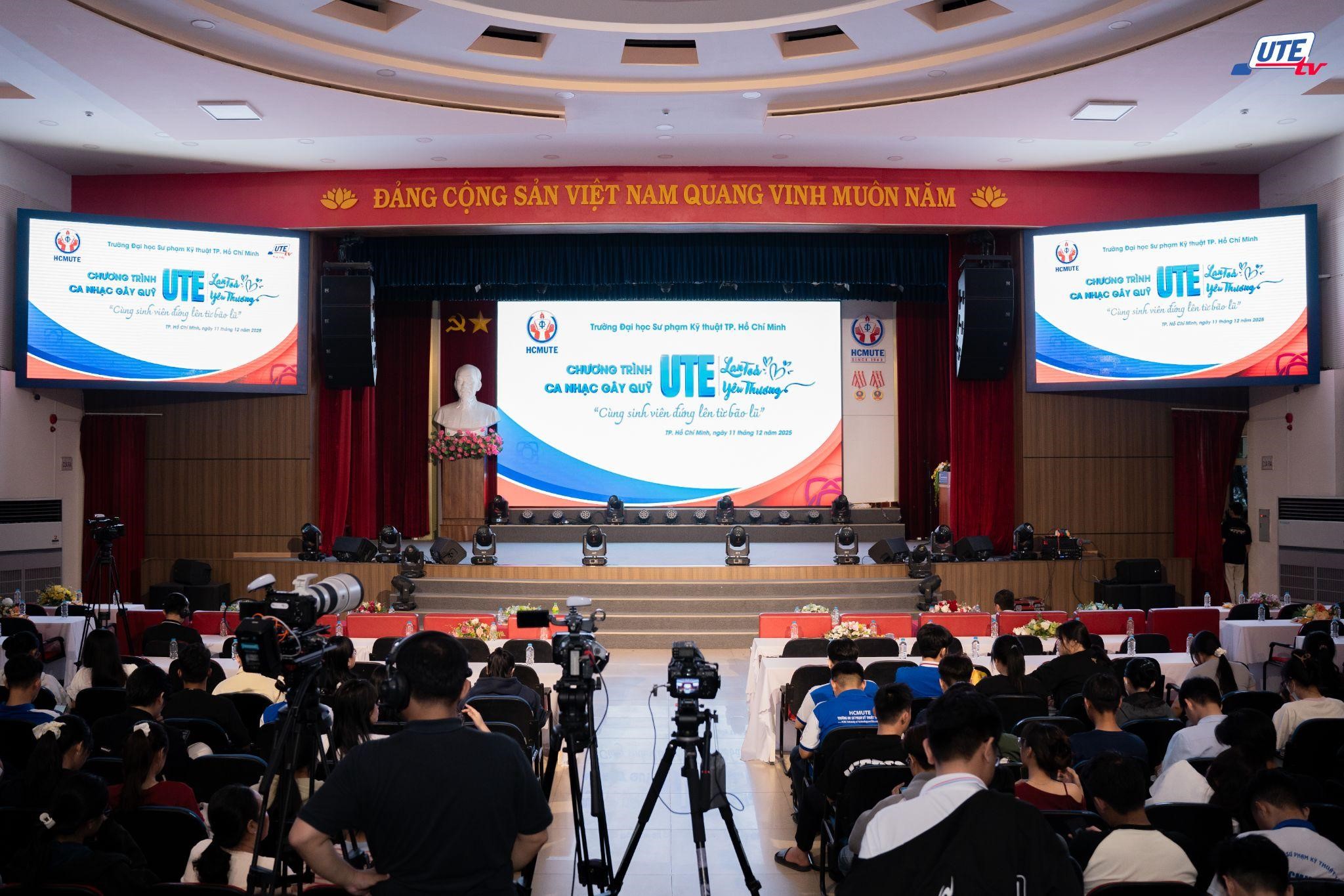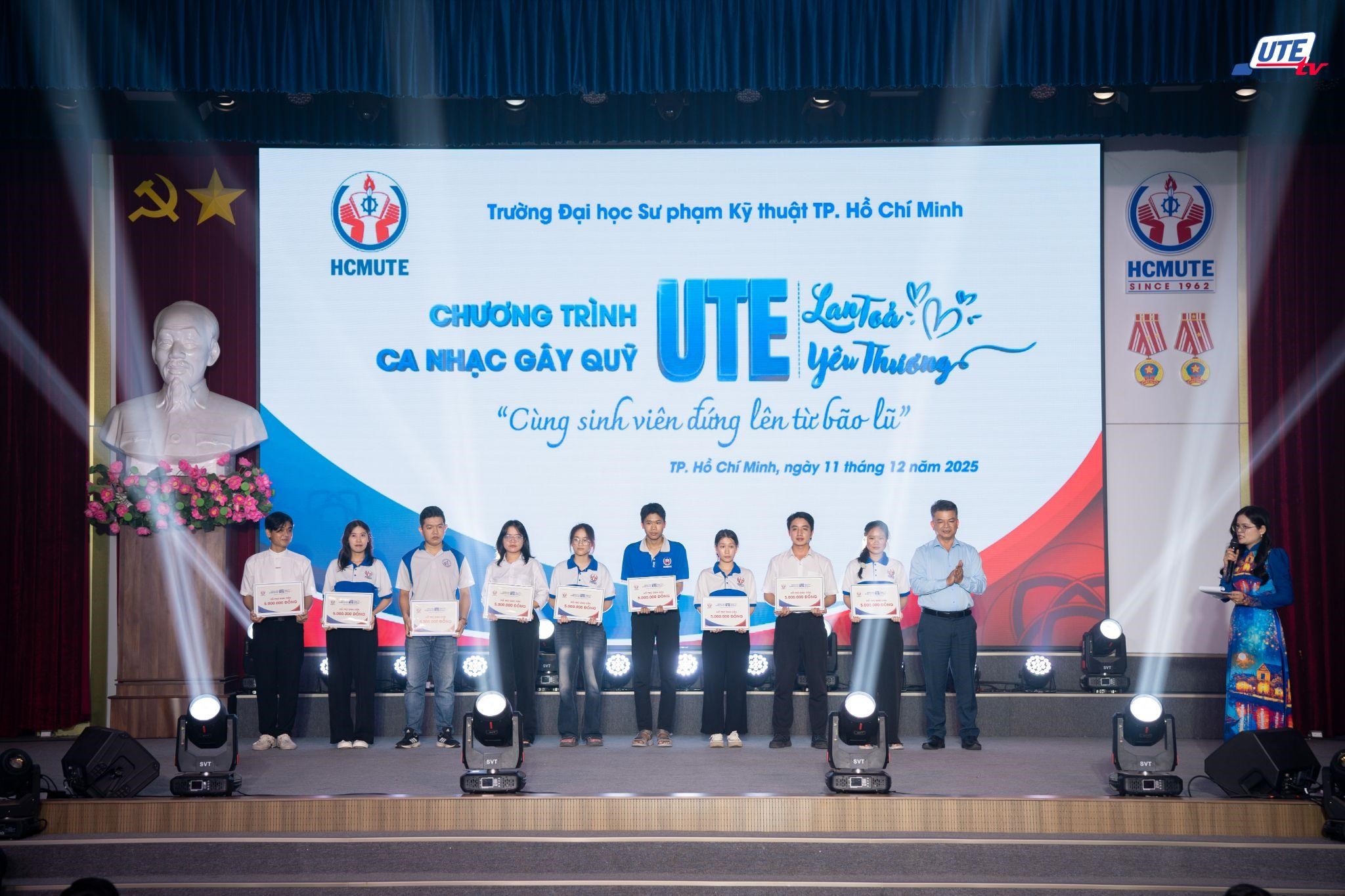Tối 11/12/2025, tại Hội trường lớn khu A, Trường Đại học Sư phạm Kỹ thuật TP.HCM (HCMUTE) đã tổ chức đêm ca nhạc gây quỹ “HCMUTE lan tỏa yêu thương – Cùng sinh viên đứng lên từ bão lũ”. Chương trình thu hút sự tham dự của đông đảo văn nghệ sĩ, các mạnh thường quân, cộng đồng cựu giáo chức, cựu sinh viên, viên chức, người lao động và người học của Nhà trường, qua đó kêu gọi được 376.918.062 đồng nhằm hỗ trợ sinh viên và học sinh có gia đình chịu thiệt hại đặc biệt nghiêm trọng trong đợt lũ lịch sử tại miền Trung năm 2025.