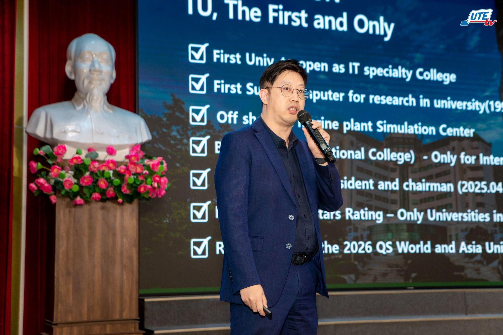 Phát biểu khai mạc hội thảo, PGS.TS. Châu Đình Thành – Phó Hiệu trưởng HCM-UTE nhấn mạnh rằng trong bối cảnh toàn cầu hóa ngày càng sâu rộng, hội nhập quốc tế không chỉ là xu thế tất yếu mà còn là yếu tố then chốt để nâng cao chất lượng giáo dục đại học. HCM-UTE luôn chú trọng đẩy mạnh hợp tác với các đối tác quốc tế uy tín, qua đó tạo điều kiện cho sinh viên được tiếp cận với môi trường học tập hiện đại, chương trình đào tạo tiên tiến và cơ hội phát triển toàn diện cả về kiến thức lẫn kỹ năng. Hội thảo hôm nay là cầu nối giúp các em tiếp cận gần hơn với nền giáo dục tiên tiến trên thế giới, từ đó tự tin xây dựng hành trình nghề nghiệp trong tương lai.