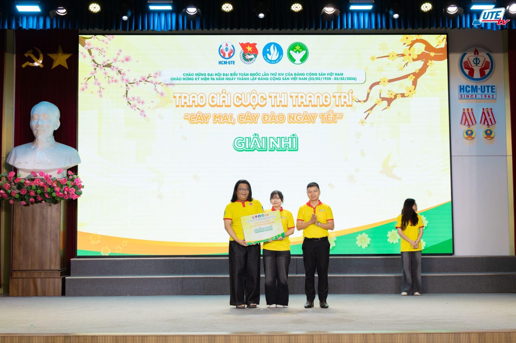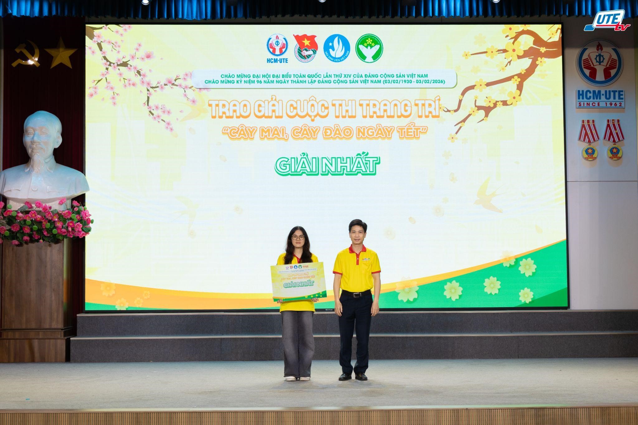 Trong khuôn khổ lễ ra quân Chiến dịch Xuân tình nguyện lần thứ 18 năm 2026, cuộc thi “Trang trí cây mai, cây đào ngày Tết” đã trở thành điểm nhấn rực rỡ, tô điểm thêm không khí vui tươi và đậm đà bản sắc cổ truyền cho buổi lễ. Cuộc thi không chỉ là sân chơi để các đội nhóm phát huy tư duy sáng tạo và khẳng định tinh thần đoàn kết, mà còn là dịp ý nghĩa để sinh viên HCM-UTE cùng tôn vinh những nét đẹp văn hóa của ngày Tết Việt. Ngay tại buổi lễ, Ban Tổ chức đã công bố kết quả và vinh danh các đội thi xuất sắc nhất, cụ thể:
