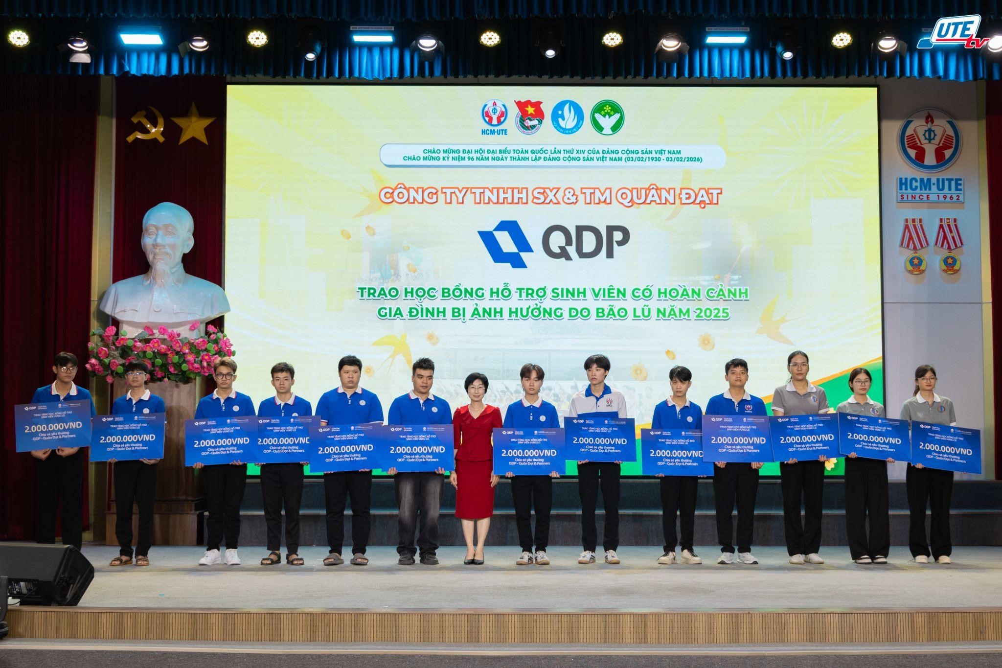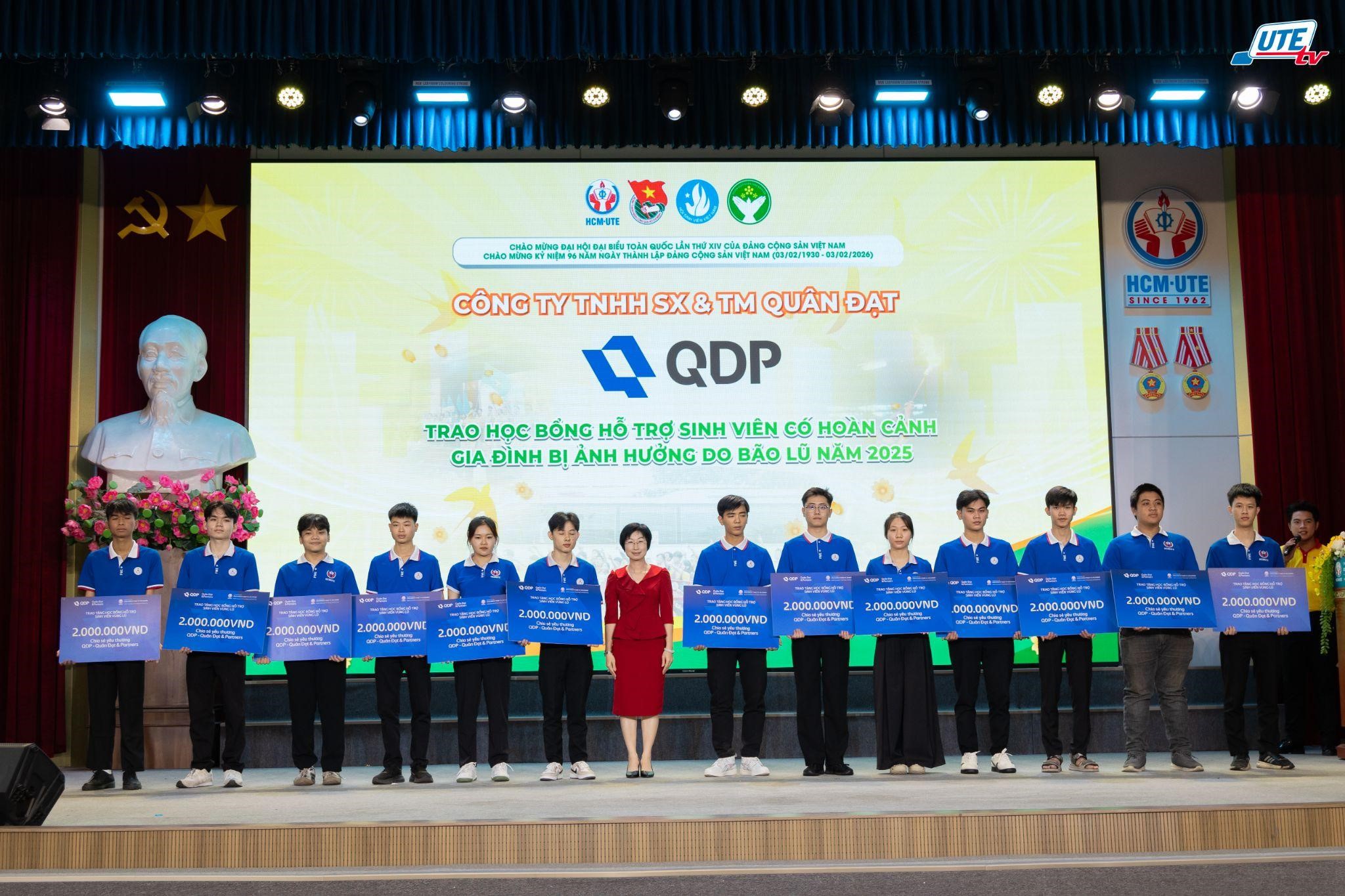 Bên cạnh đó, nhằm thể hiện trách nhiệm xã hội sâu sắc cùng sự quan tâm đặc biệt dành cho thế hệ trẻ, công ty Quân Đạt & Partners đã trao tặng 26 suất học bổng thiết thực, mỗi suất trị giá 2.000.000 đồng cho 26 sinh viên HCM-UTE có hoàn cảnh khó khăn, chịu ảnh hưởng bởi đợt bão lũ năm 2025. Món quà nghĩa tình này không chỉ tiếp thêm động lực để các em vươn lên trong học tập mà còn góp phần mang đến một mùa xuân ấm áp, lan tỏa mạnh mẽ những giá trị tốt đẹp trong cộng đồng mỗi dịp Tết đến xuân về.