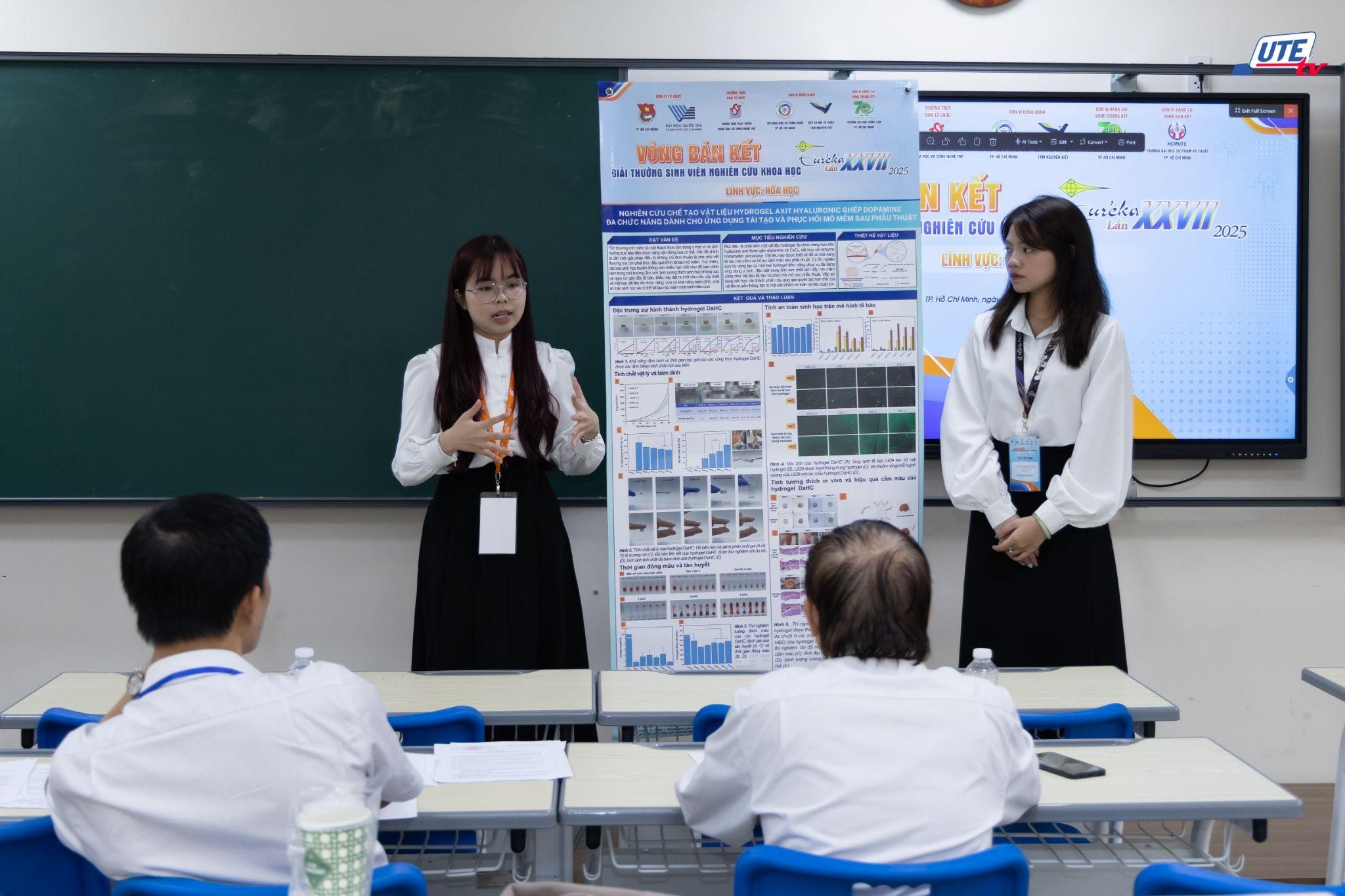 Ngay sau phần nghi thức khai mạc, vòng Bán kết Giải thưởng Sinh viên nghiên cứu khoa học Euréka lần thứ XXVII năm 2025 – lĩnh vực Hóa học được triển khai đồng thời tại các phòng hội đồng. Tại đây, các thí sinh tiến hành báo cáo kết quả nghiên cứu của mình trước Hội đồng Khoa học, trao đổi và phản biện chuyên môn theo từng chủ đề. Không khí làm việc diễn ra nghiêm túc và tập trung, nhưng cũng đầy tính cởi mở học thuật; mỗi phần trình bày không chỉ là cơ hội thể hiện nỗ lực nghiên cứu của các nhóm sinh viên mà còn là dịp để tiếp thu những gợi ý chuyên môn, định hướng hoàn thiện đề tài trước giai đoạn tiếp theo của Giải thưởng.