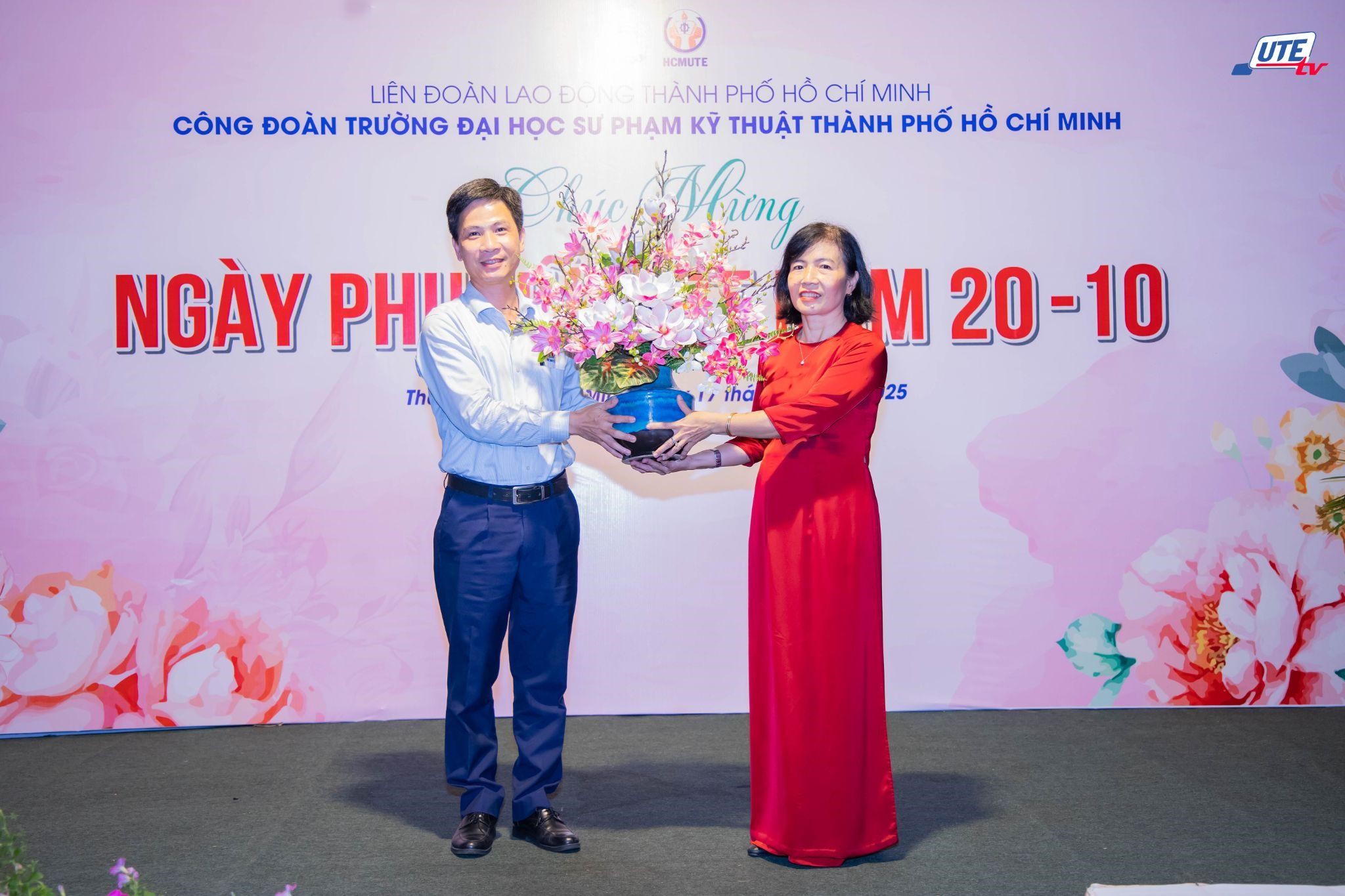 Cô Phạm Thị Hưng – Trưởng ban Nữ công Công đoàn Trường đại diện cho tập thể Công đoàn viên nữ nhận hoa chúc mừng từ PGS.TS. Châu Đình Thành – Phó Hiệu trưởng HCMUTE