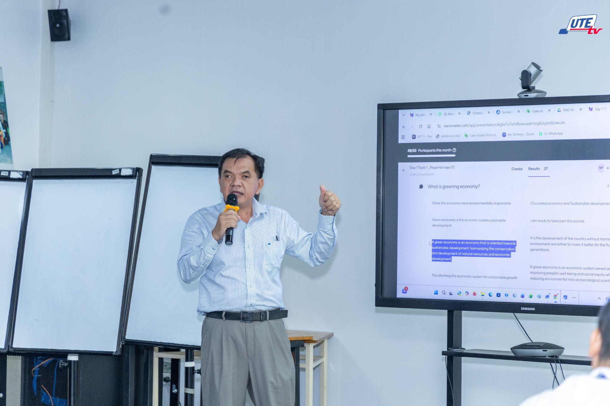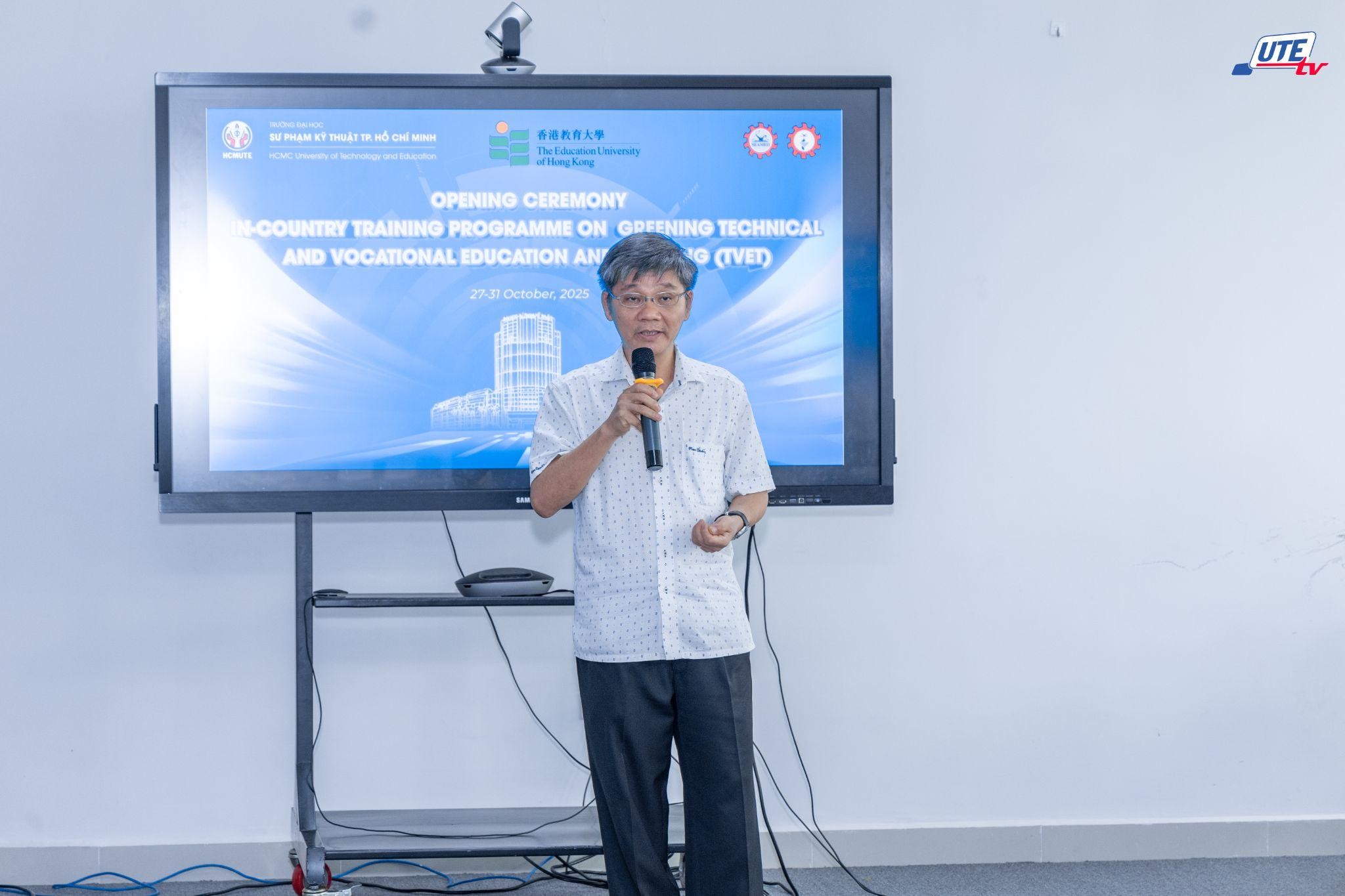 Bên cạnh đó, PGS.TS. Bùi Văn Hồng – Viện trưởng Viện Sư phạm Kỹ thuật, HCMUTE – bày tỏ kỳ vọng khóa tập huấn sẽ mang đến những kiến thức và phương pháp thiết thực, hỗ trợ giảng viên nâng cao năng lực xây dựng chương trình và triển khai các hoạt động đào tạo theo định hướng xanh. Thầy nhấn mạnh rằng việc phát triển đội ngũ giáo dục nghề nghiệp có tư duy bền vững và khả năng tích hợp kỹ năng xanh vào giảng dạy là yếu tố then chốt để HCMUTE và các cơ sở TVET trong khu vực đáp ứng yêu cầu chuyển đổi xanh và phát triển nhân lực chất lượng cao trong bối cảnh mới.