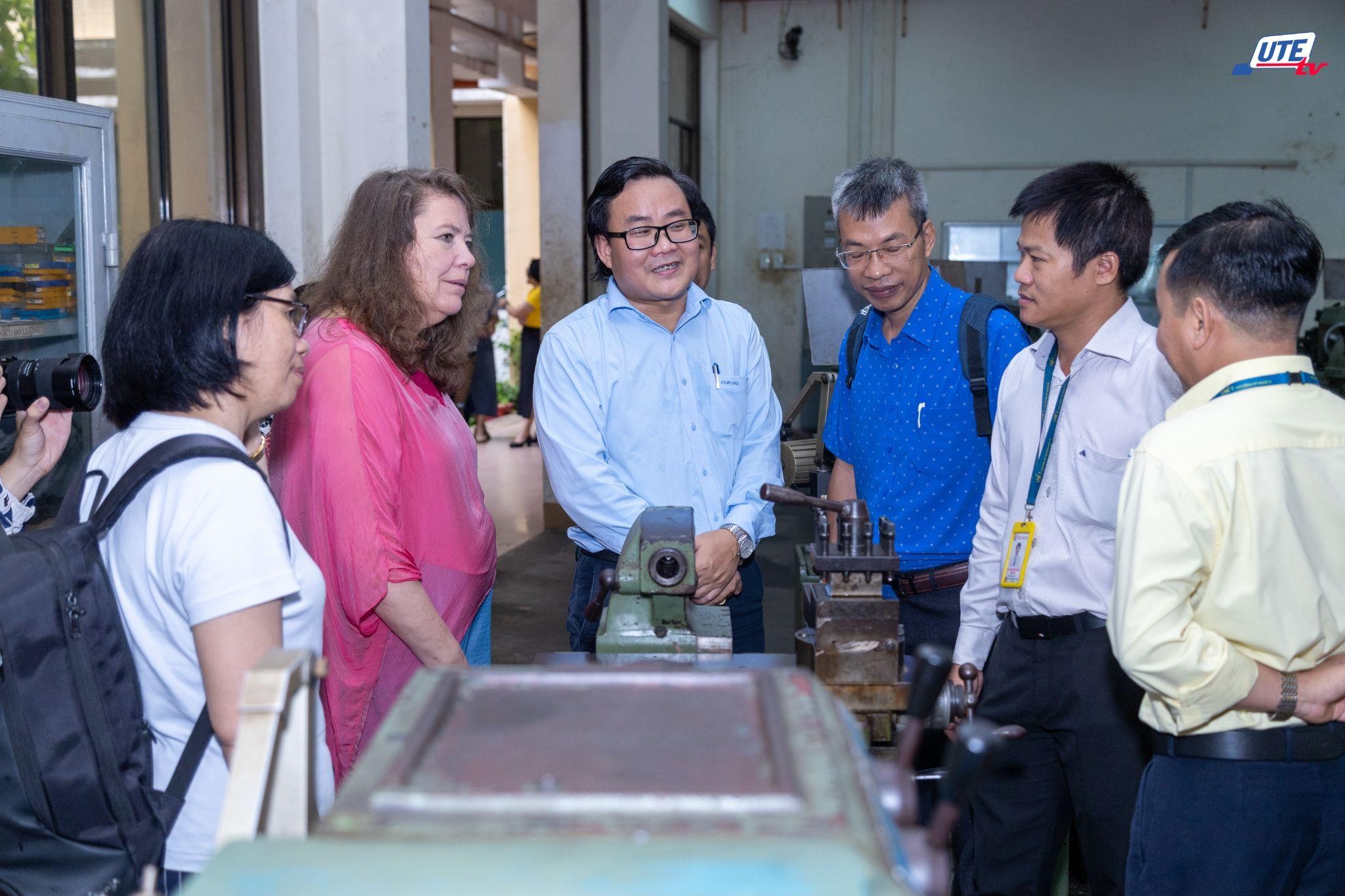Các chuyên gia quốc tế và học viên tham quan lớp học TVET và trao đổi về phương thức triển khai xanh hóa trong xưởng thực hành tại Trường Cao đẳng Kỹ nghệ II