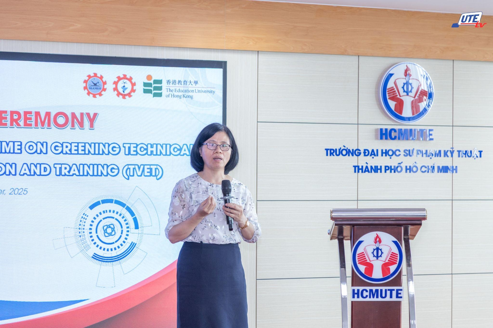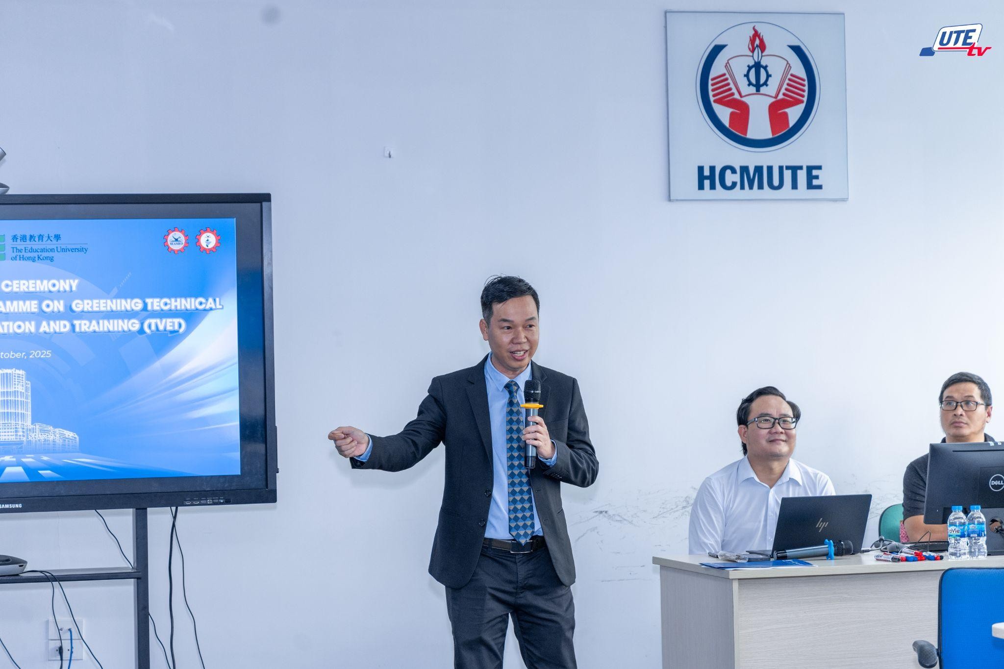 Trong khuôn khổ hợp tác tăng cường năng lực giáo dục nghề nghiệp theo định hướng xanh và phát triển bền vững, từ ngày 27 đến 31/10/2025, Trường Đại học Sư phạm Kỹ thuật TP. Hồ Chí Minh (HCMUTE) phối hợp với SEAMEO VOCTECH (Brunei) và Trường Đại học Giáo dục Hồng Kông tổ chức khóa tập huấn “Greening Technical and Vocational Education and Training (TVET)” tại phòng Dạy học số F1-608. Khóa học nhằm nâng cao nhận thức và trang bị năng lực cho đội ngũ viên chức, giảng viên TVET về kinh tế xanh, phát triển bền vững và phương pháp tích hợp các yếu tố xanh hóa vào giảng dạy, xây dựng chương trình, quản lý đào tạo, xây dựng và vận hành môi trường đào tạo, góp phần thúc đẩy thực hiện mục tiêu Phát triển bền vững SDG4 về giáo dục chất lượng và đào tạo nguồn nhân lực xanh cho quá trình chuyển đổi bền vững trong khu vực.