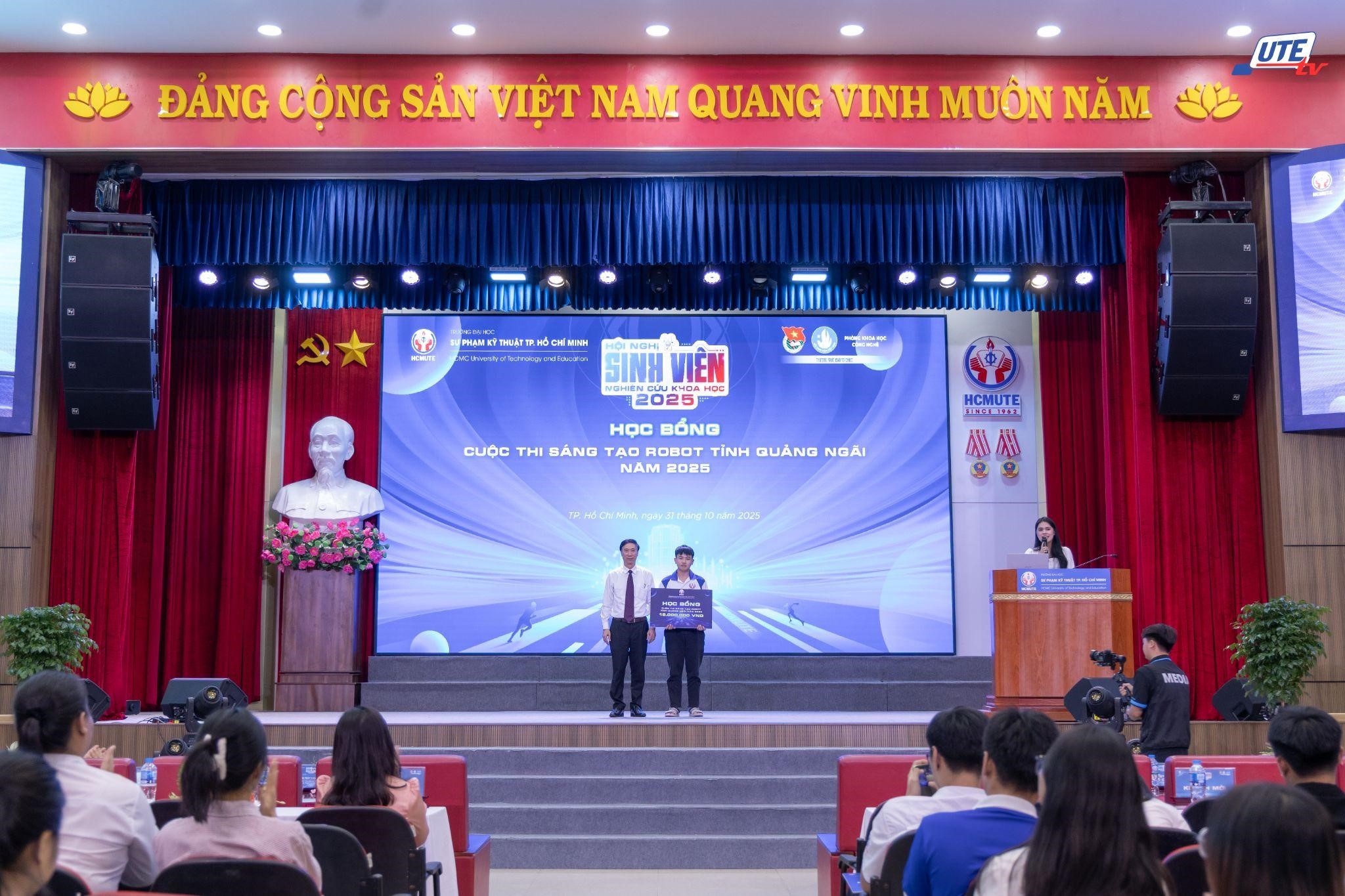 Đặc biệt, nhằm khuyến khích tinh thần nghiên cứu sáng tạo từ bậc phổ thông, Nhà trường đã trao học bổng 100% học phí học kỳ I năm học 2025-2026, trị giá 18.000.000 đồng cho sinh viên Trương Quang Khánh – thành viên đội thi đạt giải Nhất cuộc thi Sáng tạo Robot Quảng Ngãi năm 2025 và trúng tuyển vào HCMUTE.
