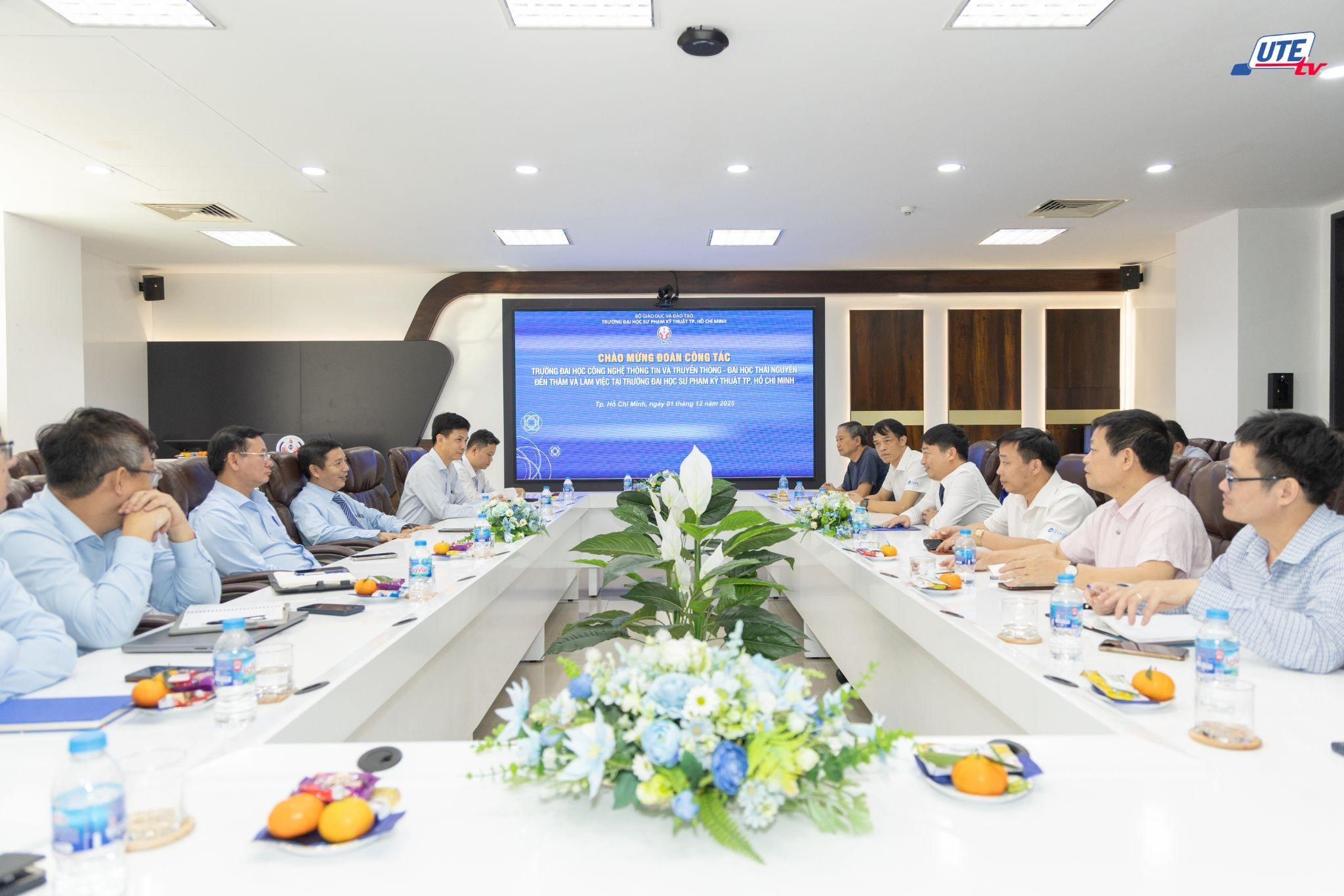 Sáng ngày 01/12/2025, Trường Đại học Sư phạm Kỹ thuật TP.HCM (HCMUTE) đã đón tiếp đoàn công tác Trường Đại học Công nghệ Thông tin và Truyền thông – Đại học Thái Nguyên (ICTU) đến thăm và làm việc. Buổi làm việc nhằm tăng cường kết nối, trao đổi kinh nghiệm quản trị đại học, định hướng phát triển và mở ra các cơ hội hợp tác trong thời gian tới giữa hai đơn vị.