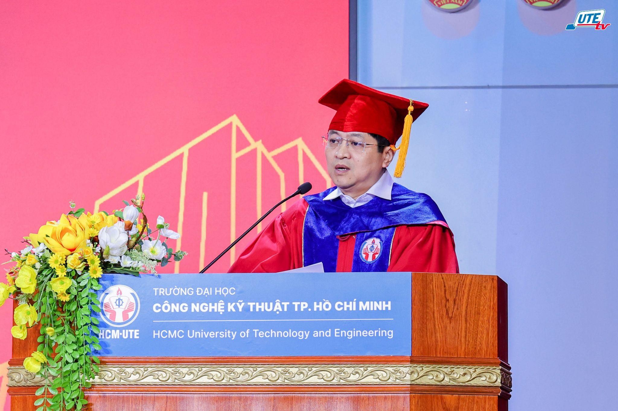 Phát biểu tại buổi lễ, PGS.TS. Lê Hiếu Giang – Hiệu trưởng Nhà trường gửi lời chúc mừng đến các tân Tiến sĩ, Thạc sĩ, Kiến trúc sư, Kỹ sư và Cử nhân đã hoàn thành một hành trình dài đầy thử thách, từ những ngày học tập miệt mài đến những đêm nghiên cứu không ngừng nghỉ. “Hôm nay, trong không khí trang trọng và đầy xúc động của Lễ tốt nghiệp, tôi vô cùng tự hào và hạnh phúc được gửi đến các em lời chúc mừng nồng nhiệt nhất. Buổi lễ này không chỉ là ngày các em chính thức nhận tấm bằng tốt nghiệp – thành quả của quá trình học tập nghiêm túc, của nỗ lực và sự bền bỉ – mà còn mang một ý nghĩa đặc biệt đối với sự phát triển của Nhà trường. Năm học này ghi dấu một cột mốc quan trọng trong lịch sử hình thành và phát triển của Trường: chính thức mang tên mới Trường Đại học Công nghệ Kỹ thuật Thành phố Hồ Chí Minh. Các em – những tân khoa tốt nghiệp hôm nay – chính là minh chứng sống động và là giá trị cốt lõi làm nên uy tín, vị thế và thương hiệu của Nhà trường. Thành quả các em đạt được hôm nay không chỉ là kết tinh của trí tuệ và công sức cá nhân, mà còn là kết quả của sự tận tâm giảng dạy của quý thầy cô giáo, là sự đồng hành, tin tưởng và hy sinh thầm lặng của gia đình và người thân. Nhà trường ghi nhận và trân trọng tất cả những nỗ lực đó.” – PGS.TS. Lê Hiếu Giang chia sẻ.