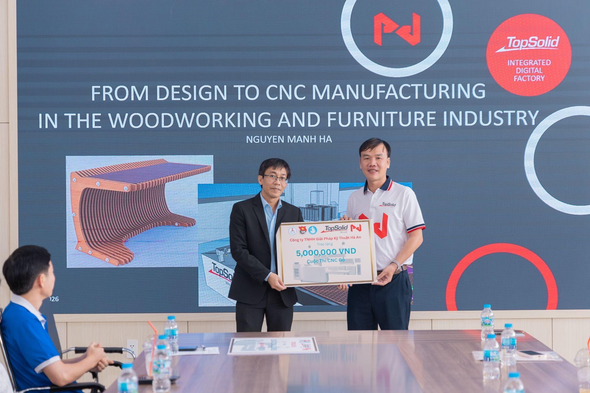 Ngoài ra, đại diện công ty TopSolid và công ty TNHH Giải pháp Kỹ thuật Hà An đã thực hiện trao tặng license giáo dục phần mềm TopSolid’Wood cho khoa Cơ khí Chế tạo máy, đồng thời tài trợ 5.000.000 đồng cho cuộc thi “Lập trình và vận hành máy CNC gia công gỗ” năm 2026. Hoạt động này nhằm hỗ trợ công tác đào tạo và tạo điều kiện cho sinh viên tiếp cận công nghệ trong quá trình học tập.