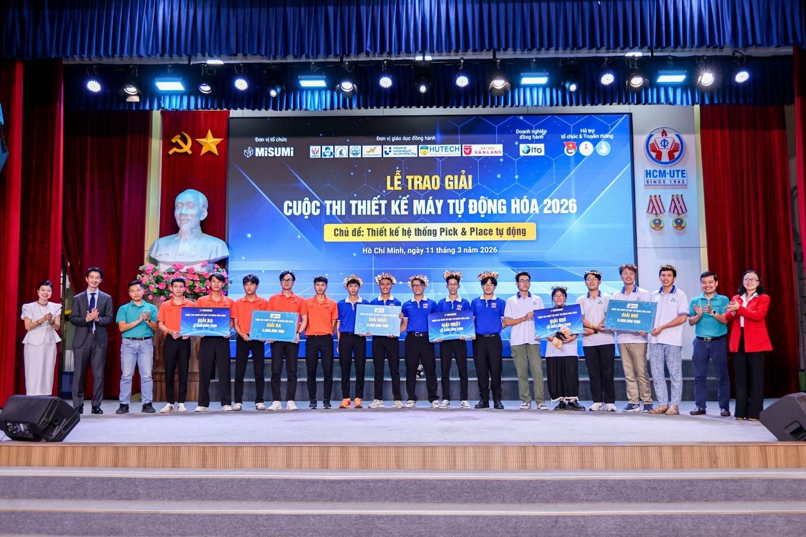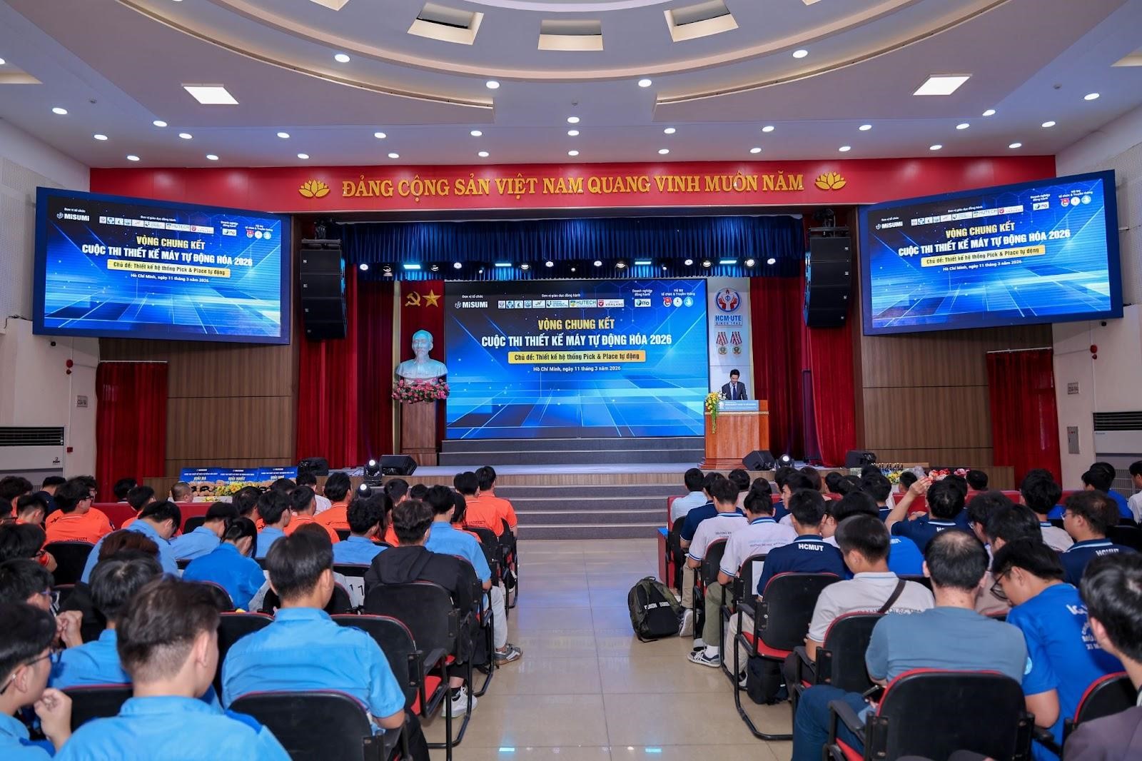 Ngày 11/03/2026, tại Hội trường lớn khu A – Trường Đại học Công nghệ Kỹ thuật TP.HCM (HCM-UTE), tiền thân là Trường Đại học Sư phạm Kỹ thuật TP.HCM, đã diễn ra Vòng Chung kết cuộc thi Thiết kế Máy tự động hóa 2026. Cuộc thi do công ty TNHH MISUMI Việt Nam tổ chức, phối hợp cùng Trường Đại học Công nghệ Kỹ thuật TP.HCM và công ty TNHH ITO Việt Nam, cuộc thi năm nay mở ra cơ hội cho các bạn sinh viên tiếp xúc với môi trường công nghiệp thực tế và theo tiêu chuẩn toàn cầu.