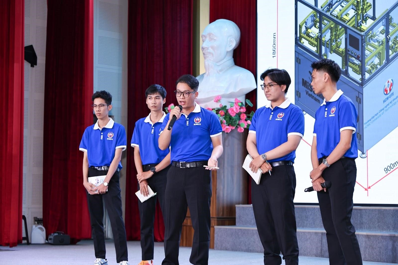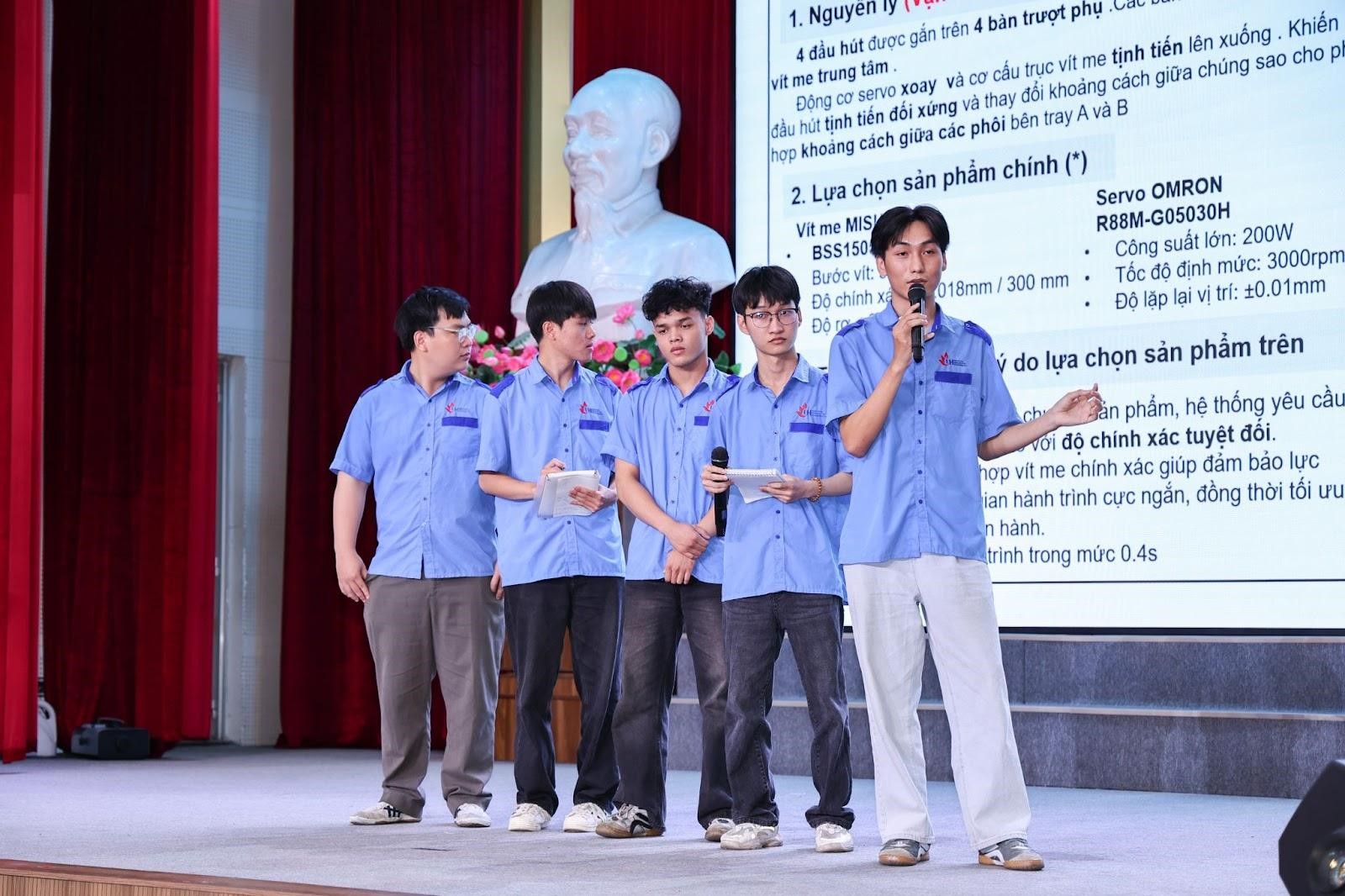 Tại vòng Chung kết, các đội thi phải hoàn thiện thiết kế chi tiết hệ thống Pick & Place tự động, đáp ứng các tiêu chuẩn khắt khe của công nghiệp thực tế và tối ưu chi phí. Không chỉ tính toán kết cấu cơ khí hay giải pháp truyền động, các sinh viên còn phải trực tiếp thuyết trình và bảo vệ tính khả thi, hiệu quả của dự án trước hội đồng giám khảo là các chuyên gia kỹ thuật dày dặn kinh nghiệm đến từ công ty TNHH MISUMI và công ty TNHH ITO Việt Nam.