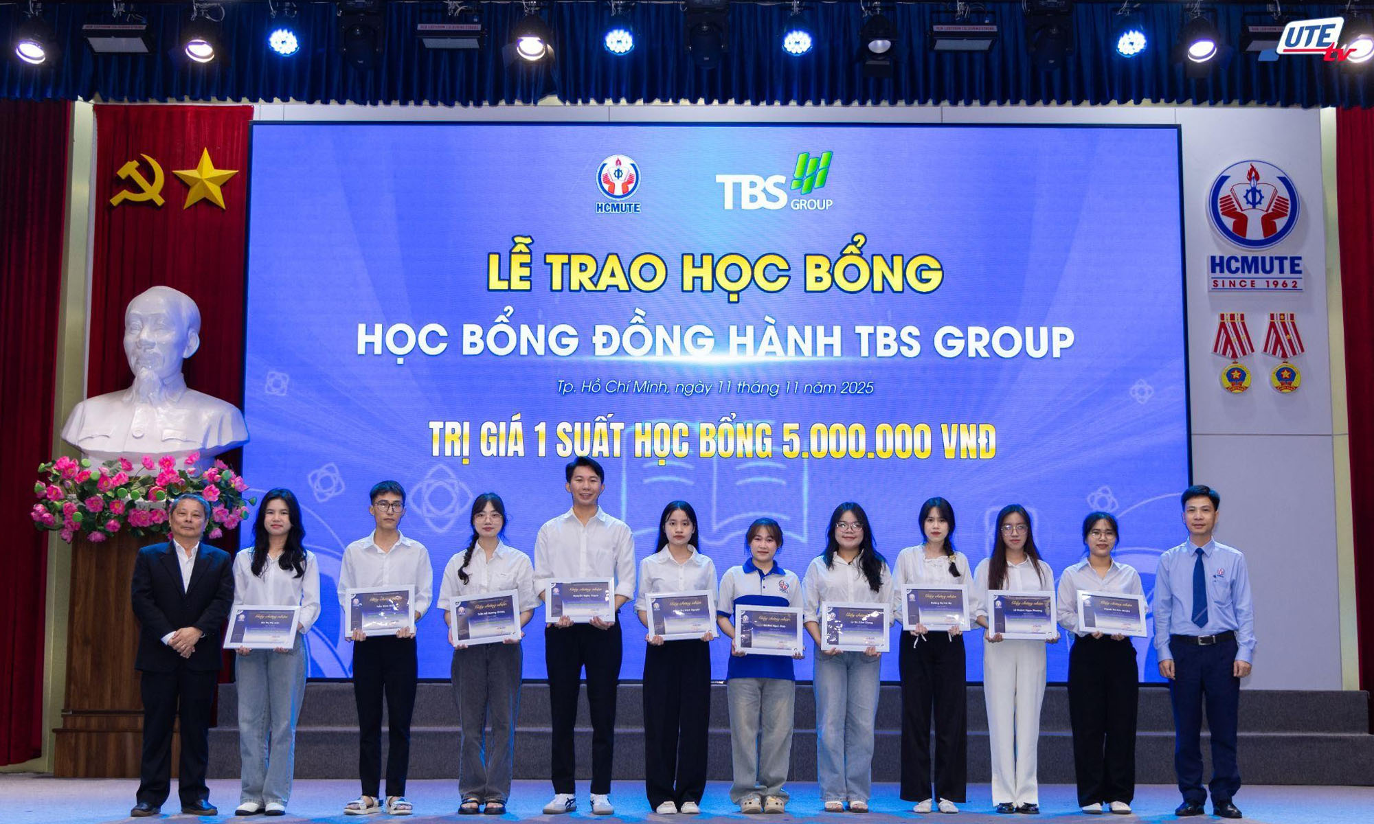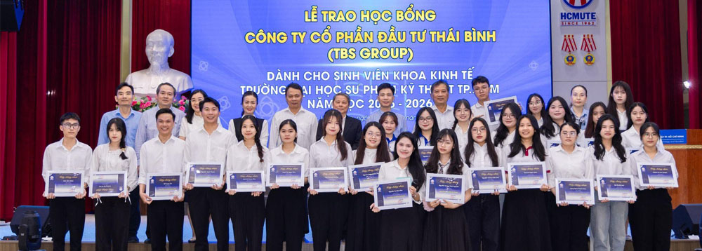 Sáng nay 11/11/2025, Trường Đại học Sư phạm Kỹ thuật TP.HCM (HCMUTE) đã phối hợp với công ty Cổ phần Đầu tư Thái Bình (TBS Group) tổ chức Lễ trao học bổng “Sinh viên Khoa Kinh tế tỏa sáng tài năng cùng TBS Group” năm 2025 dành cho 25 sinh viên Khoa Kinh tế của Nhà trường.